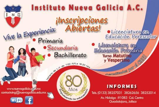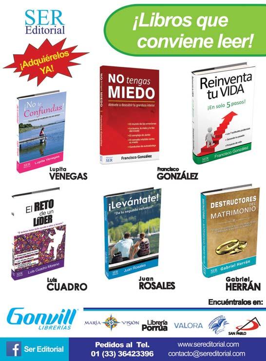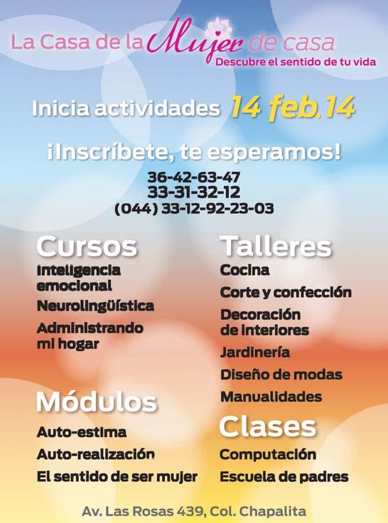 La Parroquia Santa Inés y Libera tu Vida, A.C., ofrecen el Taller “Rescatándome para la felicidad”, los viernes en la Casa Pastoral (Calle Esmeralda 1054, Alcalde Barranquitas), a las 19.30 Hrs. Informes, al 3613-8187. También invita al Taller “Conquistando mi propia voluntad”, que será en la Casa de la Acción Católica (Nuño de Guzmán 477, Col. Americana), todos los lunes. Tel. 3126-5077.