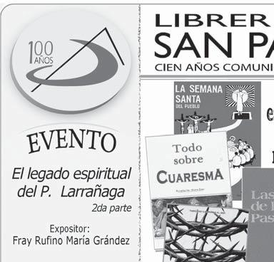 Pandillas de Cristo invita al Encuentro Espiritual de Adolescentes, de entre 13 y 19 años de edad, que se realizará del 17 al 20 de abril en la Parroquia María Virgen Fiel. Informes, al 3680-4137. Colegio Santa Anita y Escuela para Padres “Camino de Luz" invitan a su Semana de Ejercicios Espirituales para Matrimonios, del 18 al 22 de marzo, de las 19 a las 20.30 horas, en Ramón Corona 250, Santa Anita. También se expondrá el Tema “Cómo evitar que tus hijos abran una puerta falsa”, con el Lic. Noé Quintana Nikaido.