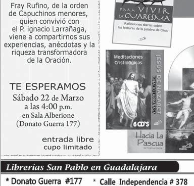 La Parroquia San Antonio de Padua ofrece la Conferencia “La Iglesia Doméstica ante la homosexualidad”, que expondrá el Predicador Rubén García el jueves 27 de marzo a las 20 horas, en Av. Copalita, Colonia Vicente Guerrero. Entrada libre. Más Informes, al Cel. 33-3874-4653. El Ministerio de Laicos Devotos de San Benito Abad, de la Parroquia de La Purísima Concepción (Obregón 485, esquina Churubusco, Sector Libertad) te invita a asistir a la Veneración de la Reliquia de San Benito Abad el domingo 23 de marzo, a partir de las 16 Hrs. Mayores informes, al 3617-0977.
