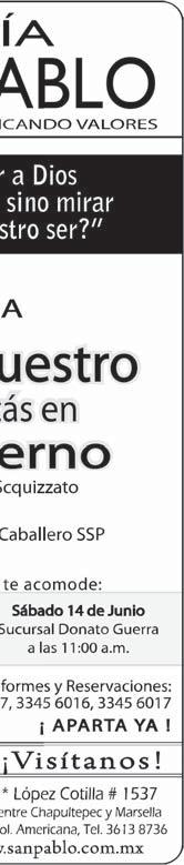 cia “Acaba con tus problemas, no con tu matrimonio”, que compartirá Lupita Venegas Leiva el 19 de junio en las instalaciones de la Parroquia, a las 20 horas. Mayores informes, al 3628-0352.