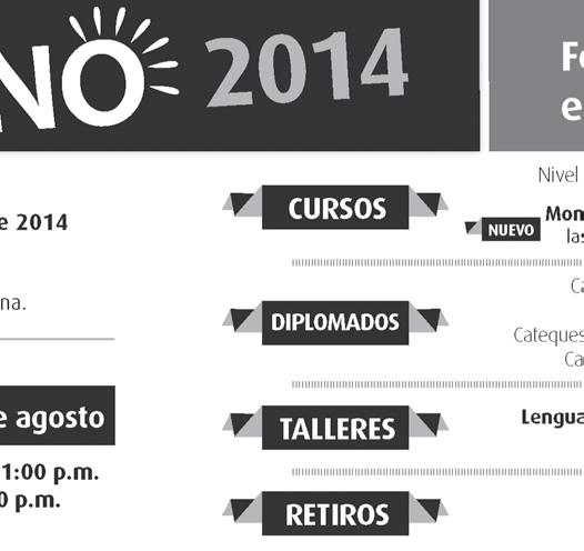 El Instituto Católico de Espiritualidad y Vida Interior convida a sus Cursos de Verano: “Taller de Arte Sacro”, “Taller de hidroponía” y “Taller de superación humana”. Se impartirán los sábados 12 ,19 y 26 de julio y el 2 de agosto, de las 10 a las 14 horas. Más informes, a los Tels. 37207720 y 3823-0464.