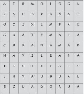Encuentra en esta sopa de letras el nombre de doce países de habla hispana.