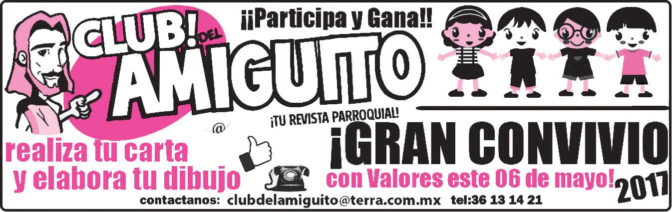 DIRECTORIO: Fundado por José H. Alba en el año de 1932. Franqueo pagado. Publicación semanal. Permiso SEPOMEX 003 0732. Características 2145522112. Certificados de Licitud de contenido y de Título número 889 y 01119. Registro Reserva 04-2003-070111165300-101. Tiraje: 40,000 ejemplares. Costo $50.00 PESOS CIENTO. Director responsable: Pbro. Antonio Gutiérrez Montaño. Colaboración: Celina María Zepeda Gutiérrez. Ilustrador: Raúl Alonso Hernández. Oficina de El Amiguito: San Felipe 578, Col. Centro. Tel. 36-13-14-21. Diseño e Impresión por: Creator Comunicación, S. de R.L. de C.V.; Isla Flores 3344. Col. Jardines de San José. Tels. 3002-6470 y 71.