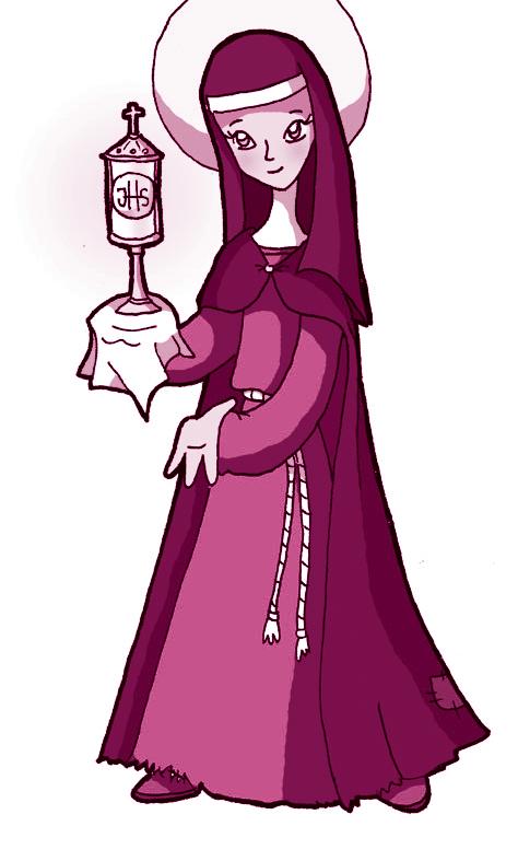 Clara nació en Asís, Italia, en 1193. Desde niña se vio dotada de innumerables virtudes y era asidua a la oración. Mostraba gran desagrado por las cosas del mundo y gran amor por su vida espiritual. Sabía de los Franciscanos, sentía amor por ellos, aunque tenía prohibido verlos. Ella les proveía enviando a una de las criadas. La conversión de Clara se efectuó al oír un sermón de San Francisco de Asís, ella tenía 18 años, y lo oyó decir que para seguir a Jesucristo hay que librarse de las riquezas y bienes materiales. Al oír: “Este es el tiempo favorable... es el momento... ha llegado el tiempo de dirigirme hacia Él que me habla al corazón desde hace tiempo...”, sintió con determina ción el llamado. Clara sabía de la oposición familiar y se fuga de su casa un Domingo de Ramos, y se consagra al Señor por manos de Francisco. Días más tarde, San Francisco, preocupado por su seguridad, dispone trasladarla a otro monasterio de Benedictinas situado en San Angelo. Allí la si gue su hermana Inés y su prima Pacífica. San Francisco pone al frente de la comunidad, como guía de Las Damas Pobres, a Santa Clara. Así se convierte en la madre amorosa de sus hijas espirituales, siendo fiel custodia y prodigiosa sanadora de las en fermas. Siempre atenta a la nece sidades de cada una de sus hijas y revelando su ternura y su aten ción de Madre, Clara acostum braba tomar los trabajos más di fíciles, y servir hasta en lo mínimo a cada una. Cuando hacía falta