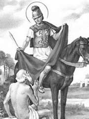 Siendo militar sucedió el hecho tan tratado en la iconografía. Era invierno, y al entrar en Amiens, encuentra un mendigo casi helado, sin ropa. Divide su clámide en dos partes y entrega una al pobre. Cristo se le aparece vestido con la media capa: «Martín, catecúmeno, me ha cubierto con este vestido».