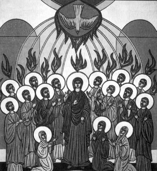 El día de Pentecostés, todos los discípulos estaban reunidos en un mismo lugar. De repente se oyó un gran ruido que venía del cielo, como cuando sopla un viento fuerte, que resonó por toda la casa donde se encontraban. Entonces aparecieron lenguas de fuego, que se distribuyeron y se posaron sobre ellos; se llenaron todos del Espíritu Santo y empezaron a hablar en otros idiomas, según el Espíritu los inducía a expresarse.
