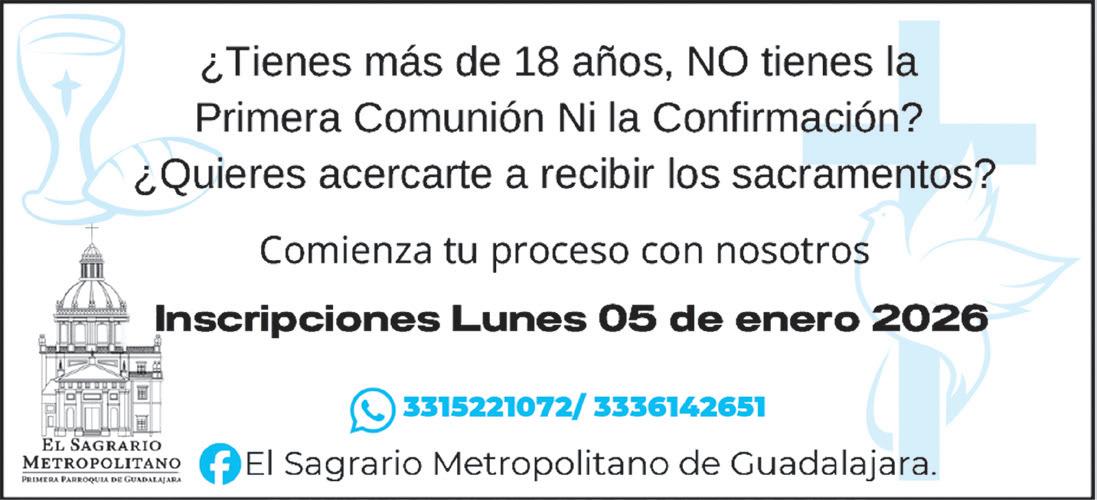 Consulta la Hoja Parroquial: www.arquidiocesisgdl.org.mx/publicaciones/hojaparroquial Diseño e Impresión: Centro Católico de Comunicaciones. Tels. 33 3002-6470 · 33 3002-6471 · Los anuncios que se muestran en La Hojita Parroquial son responsabilidad, única y exclusivamente, del solicitante. No nos hacemos responsables de los servicios que se publicitan. Boletín semanal de la Arquidiócesis de Guadalajara, A.R. Tiraje de 100,000. $65.00 ciento