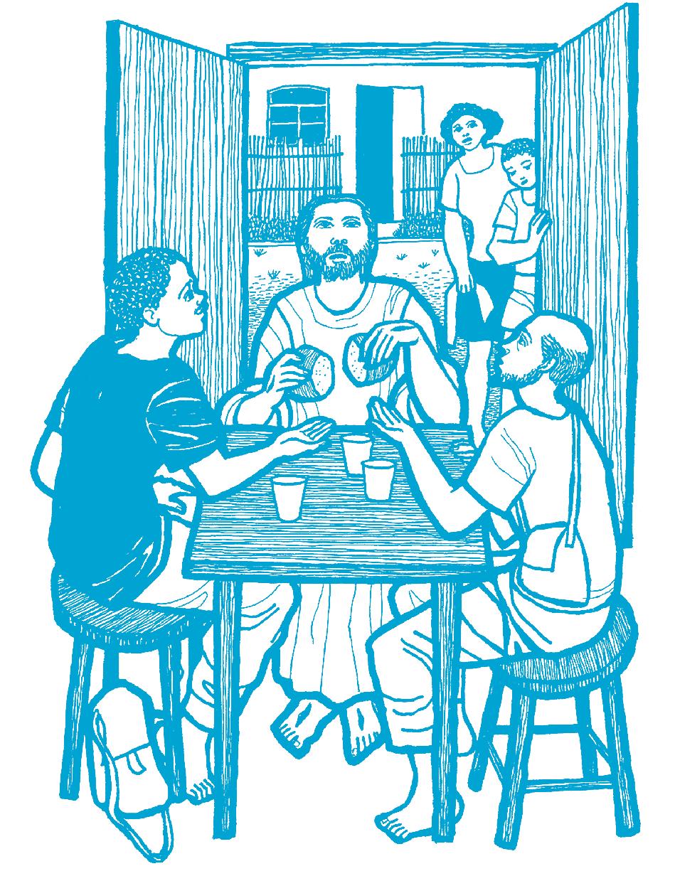 Ya cerca del pueblo a donde se dirigían, él hizo como que iba más lejos; pero ellos le insistieron, diciendo: “Quédate con nosotros, porque ya es tarde y pronto va a oscurecer”. Y entró para quedarse con ellos. Cuando estaban a la mesa, tomó un pan, pronunció la bendición, lo partió y se lo dio. Entonces se les abrieron los ojos y lo reconocieron, pero él se les desapareció. Y ellos se decían el uno al otro: “¡Con razón nuestro corazón ardía, mientras nos hablaba por el camino y nos explicaba las Escrituras!”