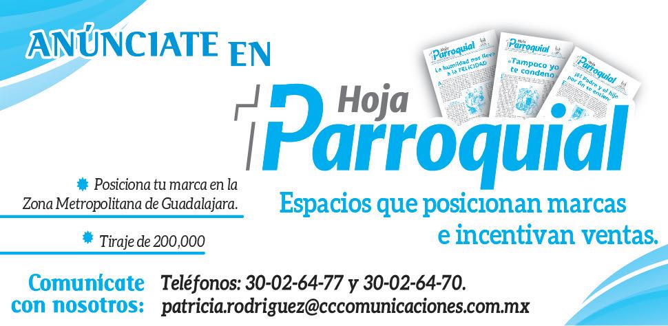 Administración: Pbro. Enrique González • Alcalde 294, Guad., Jal. Tel. 3614-2746 • Consulta la Hoja Parroquial: www.arquidiocesisgdl.org.mx/publicaciones/hojaparroquial Diseño e Impresión: Centro Católico de Comunicaciones. Tels. 3002-6470 • 3002-6471