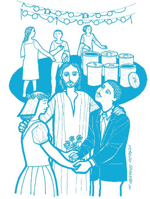 En aquel tiempo, hubo una boda en Caná de Galilea, a la cual asistió la madre de Jesús. Éste y sus discípulos también fueron invitados. Como llegara a faltar el vino, María le dijo a Jesús: “Ya no tienen vino”. Jesús le contestó: “Mujer, ¿qué podemos hacer tú y yo? Todavía no llega mi hora”. Pero ella dijo a los que servían: “Hagan lo que Él les diga”. Había allí seis tinajas de piedra, de unos cien litros cada una, que servían para las purificaciones de los judíos. Jesús dijo a los que servían: “Llenen de agua esas tinajas”. Y las llenaron hasta el borde. Entonces les dijo: “Saquen ahora un poco y llévenselo al