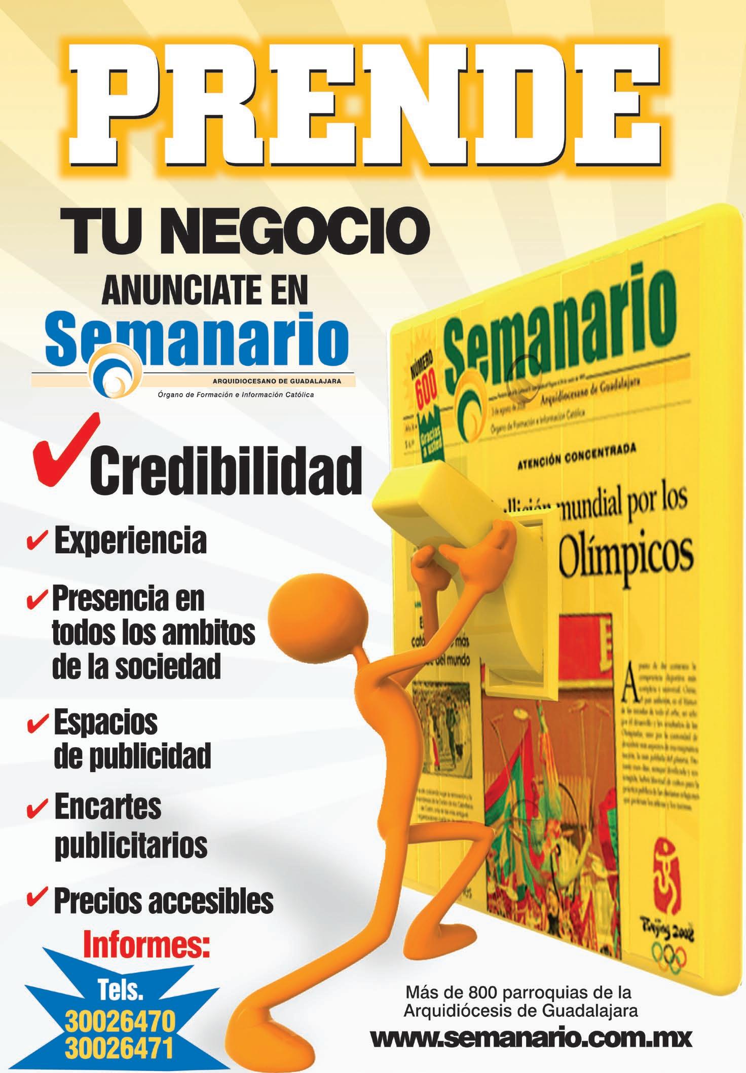 Horario de oficina: 8:30 am. a 5:30 pm., correo electrónico: semanario@cccomunicaciones.com.mx Página Internet: http://www.semanario.com.mx • Distribución: Mensajería Tercer Milenio, Jarauta No. 510-A, Tels. 3618-9670, planta alta. Guadalajara, Jal. C.P. 44360 Impreso por: Ediciones Católicas de Guadalajara, S.A. de C.V. con oficinas en Isla Flores No. 3344, Col. San José, Tlaquepaque, Jalisco. Tels. 3002-6470. Tiraje: 37,000 a 40,000