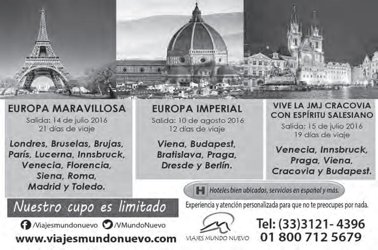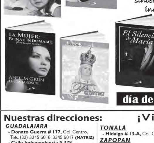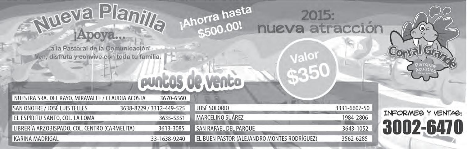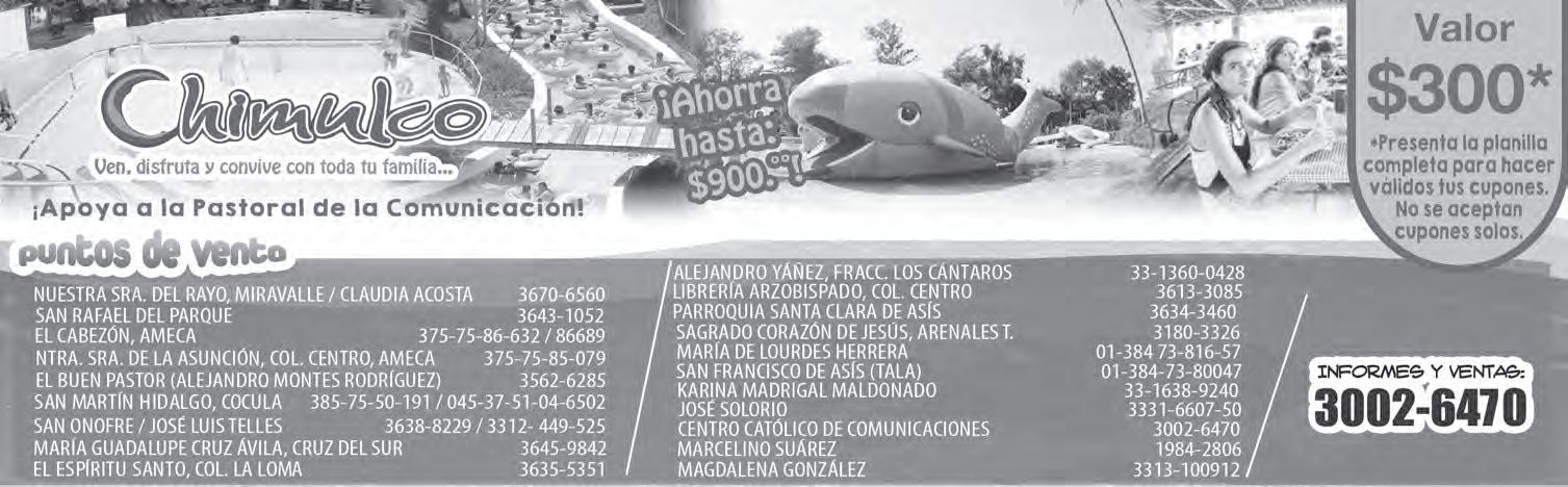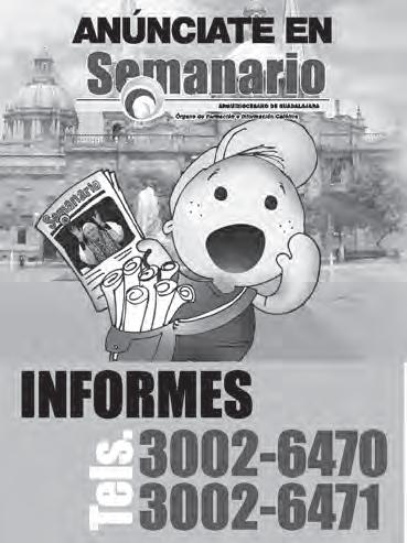 Teléfono: 3002-6470. Suscripciones: Ext. 1954 | Publicidad: Ext. 1925 | Redacción: Ext. 1922 Horario de oficina: 8:30 a.m. a 5:30 p.m., correo electrónico: semanario@cccomunicaciones.com.mx Página Internet: http://www.semanario.com.mx • Distribución: Mensajería Tercer Milenio, Jarauta N. 510-A, Tel. 3618-9670, planta alta. Guadalajara, Jal. C.P. 44360 Impreso por: Ediciones Católicas de Guadalajara, S.A. de C.V. con oficinas en Isla Flores N. 3344, Col. San José, Tlaquepaque, Jalisco. Tel. 3002-6470. Tiraje: 37,000 a 40,000