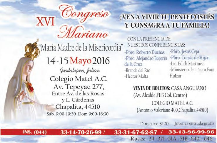 La Comunidad de Consagrados al Inmaculado Corazón de María y los Organismos Marianos de la Arquidiócesis invitan al XVI Congreso Mariano, a celebrarse el 14 y 15 de mayo en el Colegio Matel (Av. Tepeyac 277, Col. Chapalita), de las 9 a las 19 horas. Habrá Conferencias con los Presbíteros Roberto Dueñas, Tomás de Híjar, Jesús Ceja, y con expertas como Brenda del Río y Edith Martínez. Se consagrarán las familias a los Corazones de Jesús y de María. Informes, al Cel. 33-1470- 2699.