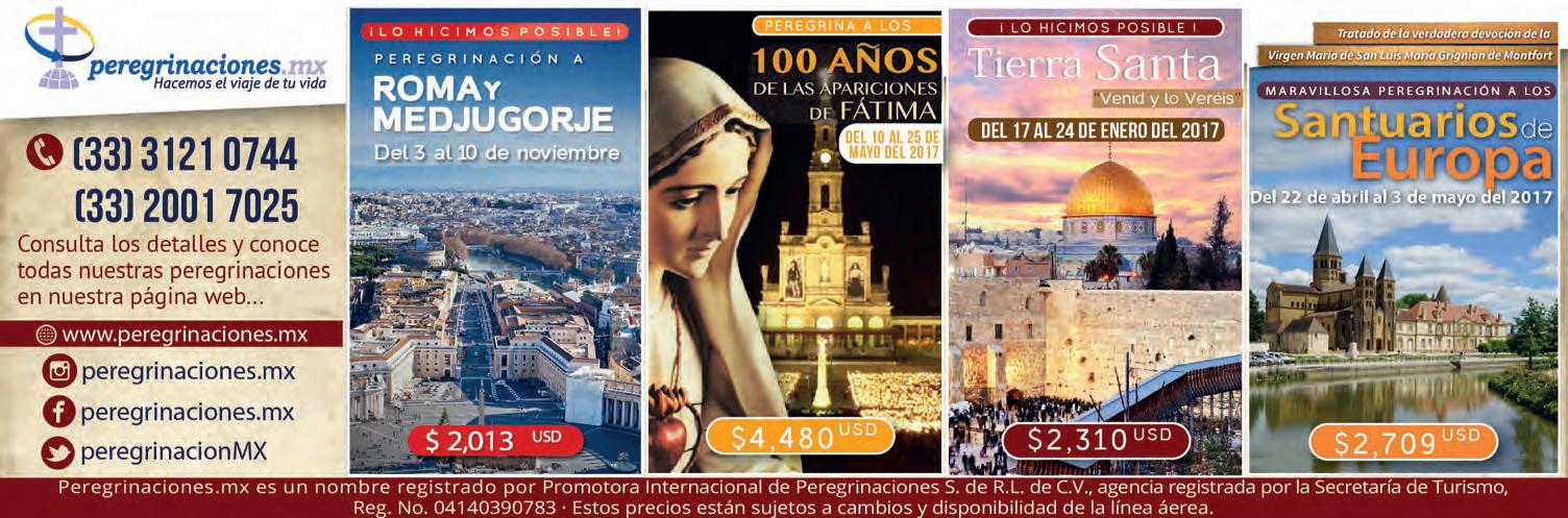 Semanario Arquidiocesano de Guadalajara • Órgano de Formación e Información Católica • Semanario Arquidiocesano de Guadalajara, fundado por el Sr. Cardenal Dn. Juan Sandoval Íñiguez, el 24 de enero de 1997 • Registrado ante la Comisión Calificadora de Publicaciones y Revistas Ilustradas —CCPRI— en Certificados de Licitud de Título y Contenido números 10296 y 7226 expediente 1/432“97”/13565 el 20 de enero de 1998 y en el Instituto Nacional de Derecho de Autor, bajo reserva al uso exclusivo del título 04-2011-070709061600-101 el 7 de julio de 2011 • Registro Postal Publicación Periódica PP14-0002-2000, autorización por SEPOMEX • No se devuelven originales. Los escritos firmados son responsabilidad del autor, no de la publicación ni del titular • Es una publicación editada por Creator Comunicación, S. de R.L. de C.V., con oficinas y redacción en Isla Flores N. 3344-2, Col. Jardines de San José, Guadalajara, Jal., México, C.P. 44950 A.P. 3-31. Los anuncios que se muestran en Semanario son responsabilidad, única y exclusivamente, del solicitante. No nos hacemos responsables de los servicios que se publicitan.