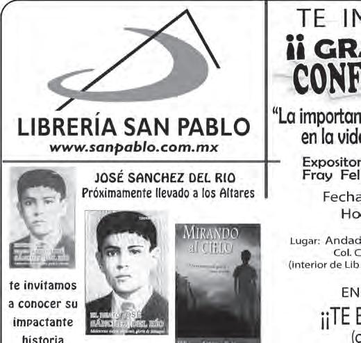 -La Parroquia de La Guadalupana (ubicada en Francisco de Ayza 2623, Sector Libertad), ofrece Pláticas: Prematrimoniales, el último domingo de cada mes, de las 8.30 a las 18 horas. Se pide que los padres de los novios asistan. Se entrega comprobante. Para Quinceañeras –papás, padrinos y chambelanes-, los domingos segundos de cada mes, de las 9 a las 12 horas, en el anexo de la Parroquia. Más información, en el Tel. 3643-8001.