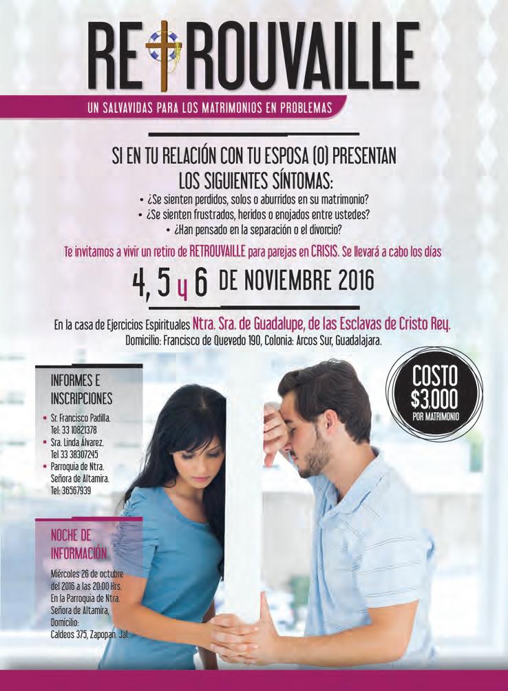 -Matrimonios Misioneros Apóstoles de la Pureza ofrecen el Retiro “Matrimonio, fuiste creado para ser y dar luz”, 29 y 30 de octubre, a partir de las 16 horas en la Casa de Retiro Servidores de la Palabra (ubicada en Calle Coyula 150, Arcos de Zalatitán II, Tonalá). Previa inscripción, cuota de recuperación voluntaria. Cupo limitado. Informes, al Cel. 33-1236-3032.