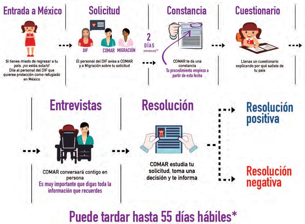 PASOS PARA SOLICITAR REFUGIO EN MÉXICO Presentar Solicitud: Acercarse a una O cina de la Comisión Mexicana de Ayuda a Refugiados (COMAR) u O cina de Regulación Migratoria del Instituto Nacional de Migración (INM), y presentar su solicitud en un plazo de 30 días hábiles después de su ingreso a México. Los niños, niñas o adolescentes también pueden avisar a funcionarios del DIF (Sistema Nacional de Desarrollo Integral de la Familia) que quieren solicitar la condición de refugiado.