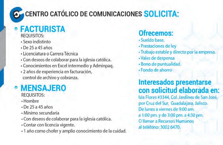 Impreso por: Ediciones Católicas de Guadalajara, S.A. de C.V. con oficinas en Isla Flores N. 3344, Col. San José, Tlaquepaque, Jalisco. Tel. 3002-6470. Tiraje: 20,000 a 25,000 Consejo Editorial: