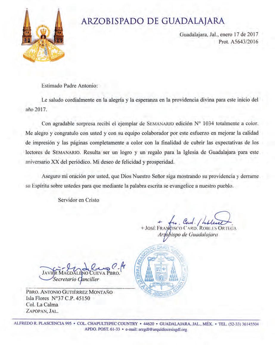 • Órgano de Formación e Información Católica • Semanario Arquidiocesano de Guadalajara, fundado por el Sr. Cardenal Dn. Juan Sandoval Íñiguez, el 24 de enero de 1997 • Registrado ante la Comisión Calificadora de Publicaciones y Revistas Ilustradas —CCPRI— en Certificados de Licitud de Título y Contenido números 10296 y 7226 expediente 1/432“97”/13565 el 20 de enero de 1998 y en el Instituto Nacional de Derecho de Autor, bajo reserva al uso exclusivo del título 04-2011-070709061600-101 el 7 de julio de 2011 • Registro Postal Publicación Periódica PP14-0002-2000, autorización por SEPOMEX • No se devuelven originales. Los escritos firmados son responsabilidad del autor, no de la publicación ni del titular • Es una publicación editada por Creator Comunicación, S. de R.L. de C.V., con oficinas y redacción en Isla Flores N. 3344-2, Col. Jardines de San José, Guadalajara, Jal., México, C.P. 44950 A.P. 3-31. Los anuncios que se muestran en Semanario son responsabilidad, única y exclusivamente, del solicitante. No nos hacemos responsables de los servicios que se publicitan.