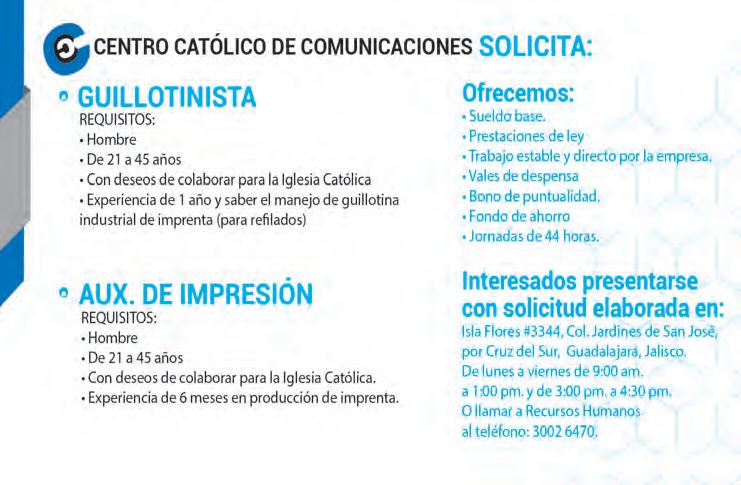 • Órgano de Formación e Información Católica • Semanario Arquidiocesano de Guadalajara, fundado por el Sr. Cardenal Dn. Juan Sandoval Íñiguez, el 24 de enero de 1997 • Registrado ante la Comisión Calificadora de Publicaciones y Revistas Ilustradas —CCPRI— en Certificados de Licitud de Título y Contenido números 10296 y 7226 expediente 1/432“97”/13565 el 20 de enero de 1998 y en el Instituto Nacional de Derecho de Autor, bajo reserva al uso exclusivo del título 04-2011-070709061600-101 el 7 de julio de 2011 • Registro Postal Publicación Periódica PP14-0002-2000, autorización por SEPOMEX • No se devuelven originales. Los escritos firmados son responsabilidad del autor, no de la publicación ni del titular • Es una publicación editada por Creator Comunicación, S. de R.L. de C.V., con oficinas y redacción en Isla Flores N. 3344-2, Col. Jardines de San José, Guadalajara, Jal., México, C.P. 44950 A.P. 3-31. Los anuncios que se muestran en Semanario son responsabilidad, única y exclusivamente, del solicitante. No nos hacemos responsables de los servicios que se publicitan.