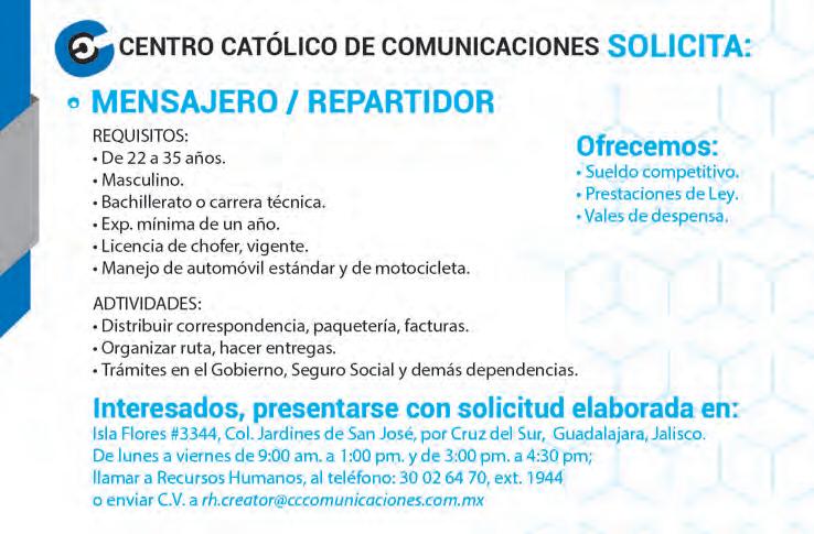 Teléfono: 3002-6470. Suscripciones: Ext. 1954 Publicidad: Ext. 1925 | Redacción: Ext. 1922 Horario de oficina: 8:30 a.m. a 5:30 p.m., correo electrónico: semanario@cccomunicaciones.com.mx Página Internet: http://www.semanario.com.mx Distribución: Mensajería Tercer Milenio, Jarauta N. 510-A, Tel. 3618-9670, planta alta. Guadalajara, Jal. C.P. 44360. Impreso por: Ediciones Católicas de Guadalajara, S.A. de C.V. con oficinas en Isla Flores N. 3344, Col. San José, Tlaquepaque, Jalisco. Tel. 3002-6470. Tiraje: 20,000 a 25,000