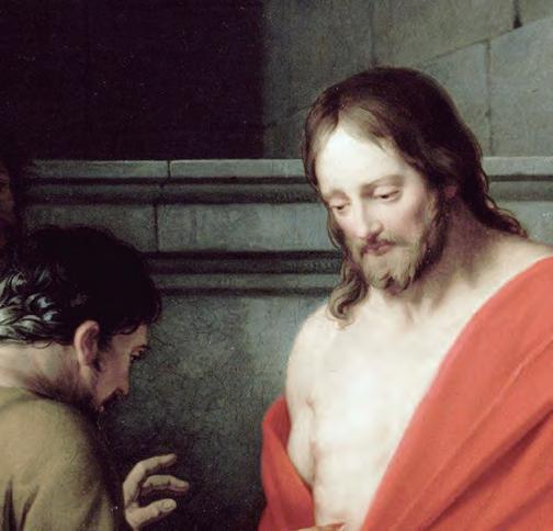 (véanse vv. 21-23). Juan cali ca el perdón de los pecados como aspecto decisivo de la pascua. Cristo resucitado obsequia a los discípulos el Espíritu que efectúa una recreación de la comunidad, ¿acaso no es el principio de una escatología ya realizada? Tomás que no estaba en el momento de la aparición, dudó del testimonio de sus hermanos y exigió pruebas (véanse vv. 24 25). Jesús se presentó de nuevo y mostrándole los estigmas de su sacri cio redentor lo exhortó: “No sigas dudando, sino cree” (v. 27). El reencuentro dio pie a la confesión de fe neotestamentaria más maravillosa: “¡Señor mío y Dios mío!” (v. 28).