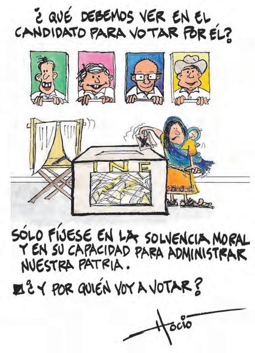 Nuestra Patria debe despertar ya y levantarse de la apatía y del desinterés por el bien común. Como mexicanos, pero más como cristianos, somos responsables todos de la construcción del país que queremos y debemos jugar un papel protagónico. Es lamentable que los cristianos tengamos cada vez menos in uencia en la gobernanza y en la toma de decisiones; es contrario a nuestra fe el no impregnar de los valores perennes y universales del Evangelio (como la verdad, la justicia, la paz, la solidaridad, etc.) en la sociedad en la que vivimos, sin que caigamos tampoco en la tentación de un régimen de cristiandad, contrario al mismo Evangelio. ¡Votemos y no permitamos que nos boten!