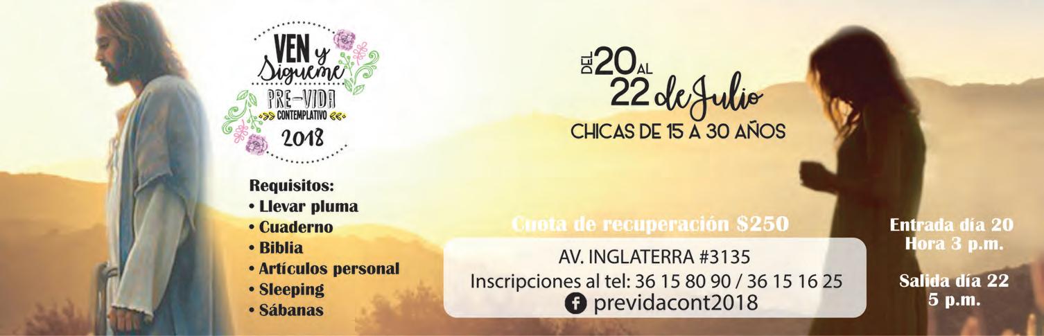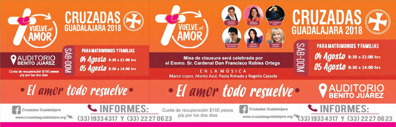 Semanario Arquidiocesano de Guadalajara • Órgano de Formación e Información Católica • Semanario Arquidiocesano de Guadalajara, fundado por el Sr. Cardenal Dn. Juan Sandoval Íñiguez, el 24 de enero de 1997 Registrado ante la Comisión Calificadora de Publicaciones y Revistas Ilustradas —CCPRI— en Certificados de Licitud de Título y Contenido números 10296 y 7226 expediente 1/432“97”/13565 el 20 de enero de 1998 y en el Instituto Nacional de Derecho de Autor, bajo reserva al uso exclusivo del título 04-2018-021211450400-101 el 12 de febrero de 2018 Registro Postal Publicación Periódica PP14-0002-2000, autorización por SEPOMEX No se devuelven originales. Los escritos firmados son responsabilidad del autor, no de la publicación ni del titular Es una publicación editada por Creator Comunicación, S. de R.L. de C.V., con oficinas y redacción en Isla Flores N. 3344-2, Col. Jardines de San José, Guadalajara, Jal., México, C.P. 44950 A.P. 3-31. Los anuncios que se muestran en Semanario son responsabilidad, única y exclusivamente, del solicitante. No nos hacemos responsables de los servicios que se publicitan.