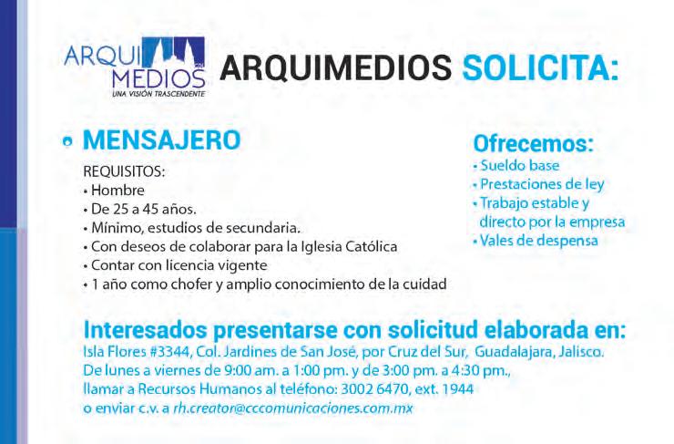 Semanario Arquidiocesano de Guadalajara • Órgano de Formación e Información Católica • Semanario Arquidiocesano de Guadalajara, fundado por el Sr. Cardenal Dn. Juan Sandoval Íñiguez, el 24 de enero de 1997 Registrado ante la Comisión Calificadora de Publicaciones y Revistas Ilustradas —CCPRI— en Certificados de Licitud de Título y Contenido números 10296 y 7226 expediente 1/432“97”/13565 el 20 de enero de 1998 y en el Instituto Nacional de Derecho de Autor, bajo reserva al uso exclusivo del título 04-2018-021211450400-101 el 12 de febrero de 2018 Registro Postal Publicación Periódica PP14-0002-2000, autorización por SEPOMEX No se devuelven originales. Los escritos firmados son responsabilidad del autor, no de la publicación ni del titular Es una publicación editada por Creator Comunicación, S. de R.L. de C.V., con oficinas y redacción en Isla Flores N. 3344-2, Col. Jardines de San José, Guadalajara, Jal., México, C.P. 44950 A.P. 3-31. Los anuncios que se muestran en Semanario son responsabilidad, única y exclusivamente, del solicitante. No nos hacemos responsables de los servicios que se publicitan.