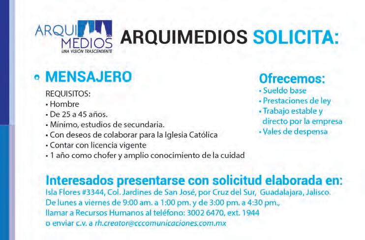 Teléfono: 3002-6470. Suscripciones: Ext. 1954 Publicidad: Ext. 1925 | Redacción: Ext. 1922 Horario de oficina: 8:30 a.m. a 5:30 p.m., correo electrónico: semanario@cccomunicaciones.com.mx Página Internet: http://www.semanario.com.mx Distribución: Mensajería Tercer Milenio, Jarauta N. 510-A, Tel. 3618-9670, planta alta. Guadalajara, Jal. C.P. 44360. Impreso por: Ediciones Católicas de Guadalajara, S.A. de C.V. con oficinas en Isla Flores N. 3344, Col. San José, Tlaquepaque, Jalisco. Tel. 3002-6470. Tiraje: 20,000 a 25,000