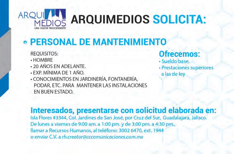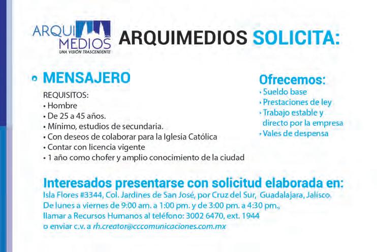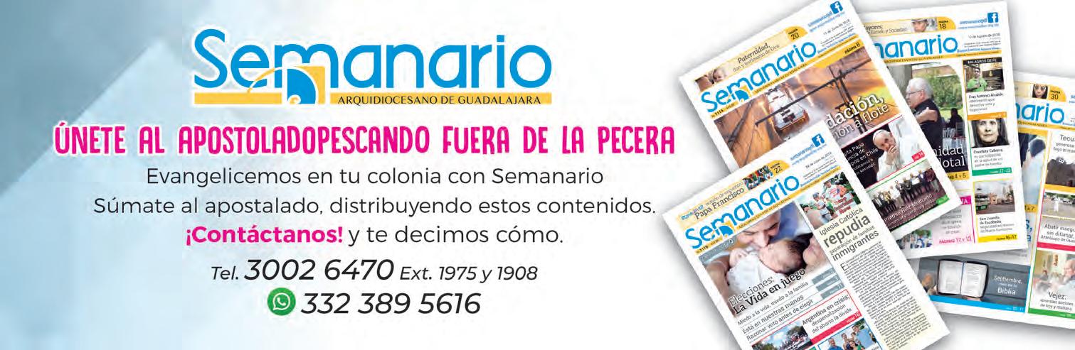 Semanario Arquidiocesano de Guadalajara • Órgano de Formación e Información Católica • Semanario Arquidiocesano de Guadalajara, fundado por el Sr. Cardenal Dn. Juan Sandoval Íñiguez, el 24 de enero de 1997 Registrado ante la Comisión Calificadora de Publicaciones y Revistas Ilustradas —CCPRI— en Certificados de Licitud de Título y Contenido números 10296 y 7226 expediente 1/432“97”/13565 el 20 de enero de 1998 y en el Instituto Nacional de Derecho de Autor, bajo reserva al uso exclusivo del título 04-2018-021211450400-101 el 12 de febrero de 2018 Registro Postal Publicación Periódica PP14-0002-2000, autorización por SEPOMEX No se devuelven originales. Los escritos firmados son responsabilidad del autor, no de la publicación ni del titular Es una publicación editada por Creator Comunicación, S. de R.L. de C.V., con oficinas y redacción en Isla Flores N. 3344-2, Col. Jardines de San José, Guadalajara, Jal., México, C.P. 44950 A.P. 3-31. Los anuncios que se muestran en Semanario son responsabilidad, única y exclusivamente, del solicitante. No nos hacemos responsables de los servicios que se publicitan.