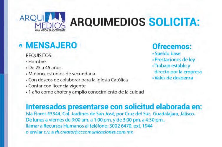 Teléfono: 3002-6470. Suscripciones: Ext. 1954 | Publicidad: Ext. 1906+1925 | Redacción: Ext. 1922 Horario de oficina: 8:30 a.m. a 5:30 p.m., correo electrónico: semanario@cccomunicaciones.com.mx Página Internet: http://www.semanario.com.mx Distribución: Mensajería Tercer Milenio, Jarauta N. 510-A, Tel. 3618-9670, planta alta. Guadalajara, Jal. C.P. 44360. Impreso por: Ediciones Católicas de Guadalajara, S.A. de C.V. con oficinas en Isla Flores N. 3344, Col. San José, Tlaquepaque,