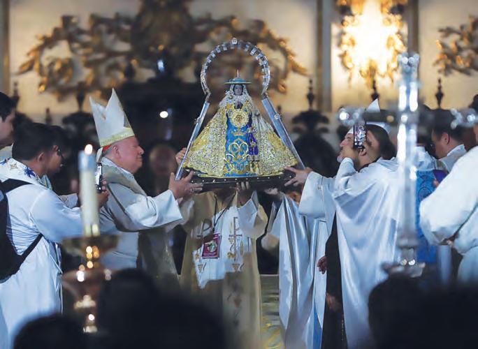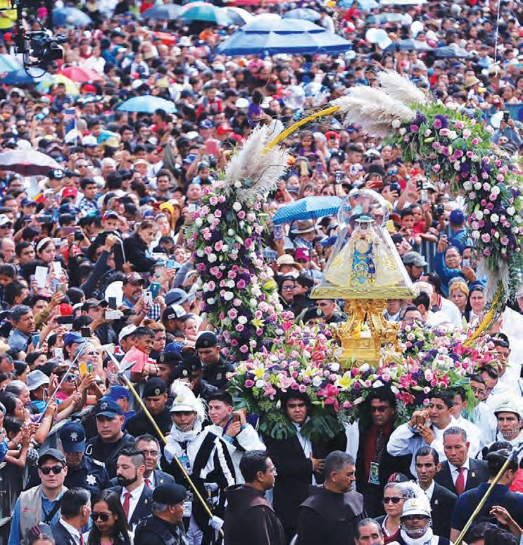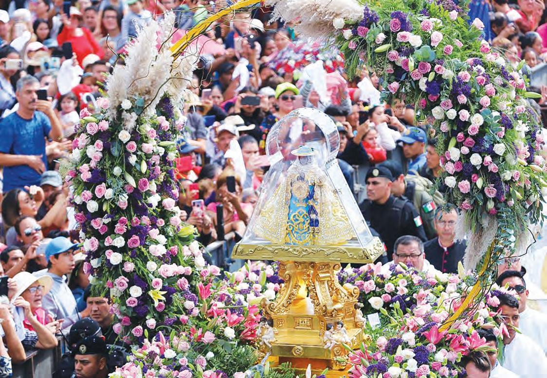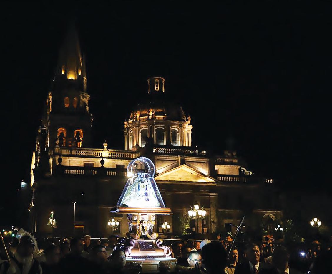 a este lugar, y a los hijos de este lugar, el fraile misionero Antonio de Segovia dejó como el regalo más preciado a aquella pequeñita Imagen de la Inmaculada Concepción, que portaba en su pecho, anunciando la alegría del Evangelio en estas tierras, y paci cando a los pueblos que se habían sublevado, tejiendo así, como en ligrana, las nuevas relaciones de una sociedad que comenzaba. Desde entonces ella se ha hecho parte del caminar de nuestro pueblo, entrando profundamente en el tejido de la historia y acogiendo los rasgos más nobles y signi cativos de su gente, de modo que la Virgen de Zapopan la sentimos muy nuestra, como madre y hermana. En esta pequeña, pero signi cativa imagen, María acompaña la gestación de este pueblo. En su advocación de Zapopan nos ha acompañado a lo largo de esta nuestra historia. A ella se le han encomendado, desde 1734, el patrocinio sobre inundaciones, rayos y centellas. Para nosotros, es la advocación que acompañó la gesta de Independencia, como Generala de las tropas insurgentes de la Nueva Galicia, que lograron la libertad sin derramamiento de sangre. A ella, a la taumaturga Imagen, se le ha encomendado la protección de la Arquidiócesis de Guadalajara y la protección del Lago de Chapala.