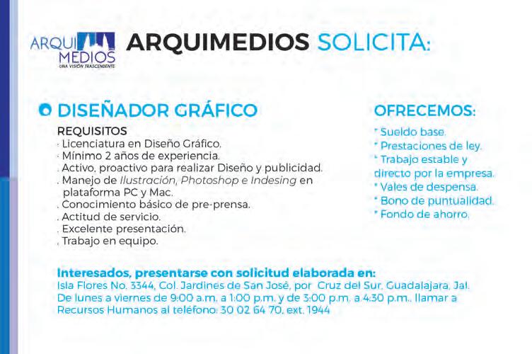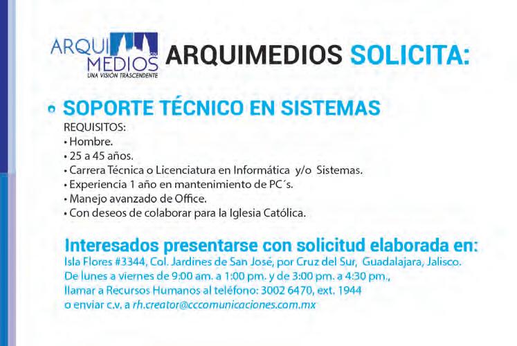 Teléfono: 3002-6470. Suscripciones: Ext. 1954 | Publicidad: Ext. 1906+1925 | Redacción: Ext. 1922 Horario de oficina: 8:30 a.m. a 5:30 p.m., correo electrónico: semanario@cccomunicaciones.com.mx Página Internet: http://www.semanario.com.mx Distribución: Mensajería Tercer Milenio, Jarauta N. 510-A, Tel. 3618-9670, planta alta. Guadalajara, Jal. C.P. 44360. Impreso por: Ediciones Católicas de Guadalajara, S.A. de C.V. con oficinas en Isla Flores N. 3344, Col. San José, Tlaquepaque,