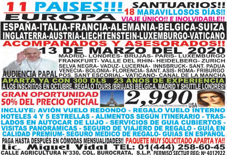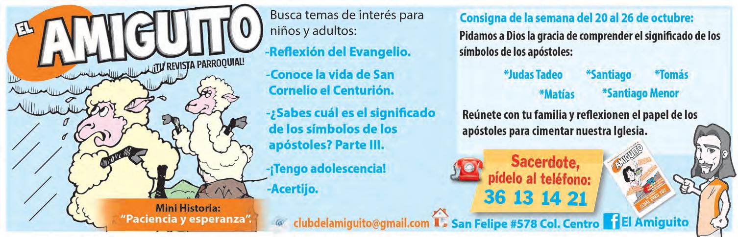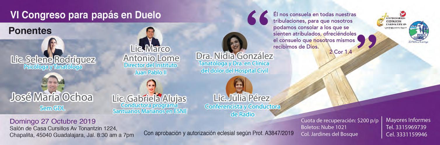 las 10:00 horas, en calle Cobre #4235 por Av. Cruz del Sur, junto a la tienda Waldo´s. ● Vigilia en preparación a los 100 años de la Adoración Nocturna Tapatía. Sábado 26 de octubre, Vicaría de Chapala; Parroquia Virgen de Guadalupe, Zapotitlán de Hidalgo, Jal. Recepción a las 3:30 p.m. Conferencia “La Eucaristía: nombre y naturaleza”.