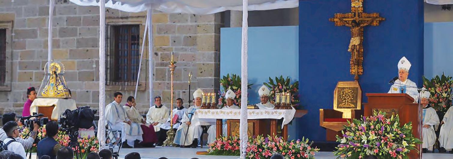 Al consagrar a la Virgen de Zapopan la sociedad jalisciense, para que recobre su identidad en sus raíces más profundas y pueda vivir en justicia, armonía y paz, insistió en que hoy “quizá más que nunca, la Iglesia debe aparecer como María Madre de Misericordia y Pacicadora, por eso a la Virgen Santísima de Zapopan, nuestra amada patrona, que está por celebrar el centenario de su coronación ponti cia, encomendamos todos los trabajos pastorales para que bajo su amparo y a ejemplo de ella, la Iglesia resplandezca en el mundo como signo de misericordia y de paz”.