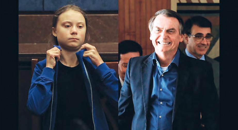 La contra cara de Greta, incluso en lo generacional es sin duda Jair Bolsonaro, el baby boomer ultraconservador que gobierna Brasil y a quien le han llovido críticas por los pasados incendios que asolaron la sel-