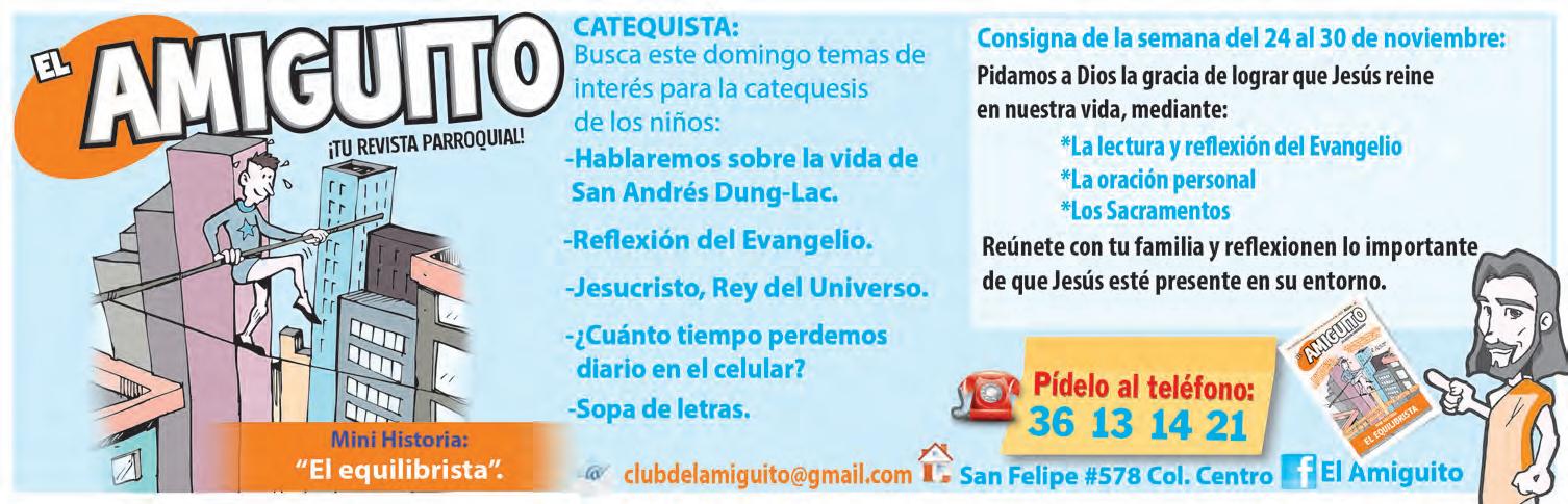 En efecto, nos causan pánico las desapariciones de personas, los robos en la calle, los asaltos a nuestras casas, etc. En medio de todos estos signos de maldad, los discípulos de Jesús tenemos que construir la paz, establecer relaciones de con anza entre nosotros, darnos seguridad, respetar y hacer respetar la dignidad de las personas. Que no nos gane el pánico, porque el último día, Jesús se va a manifestar como el sol que todo lo ilumina, el sol de justicia que todo lo paci ca y aclara.