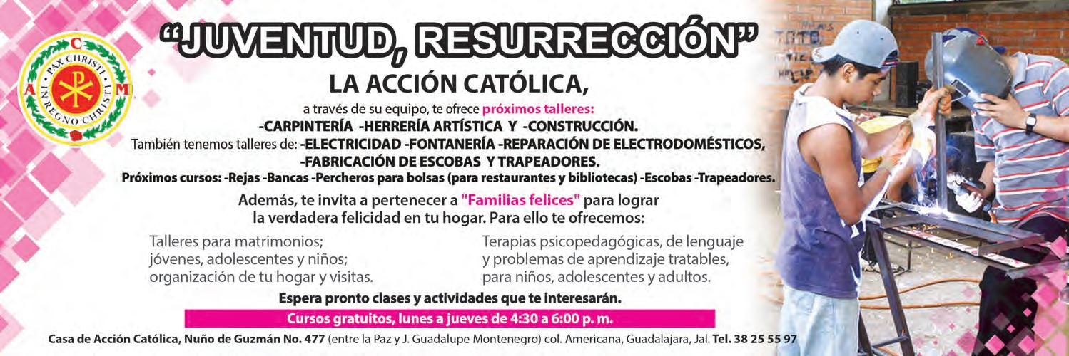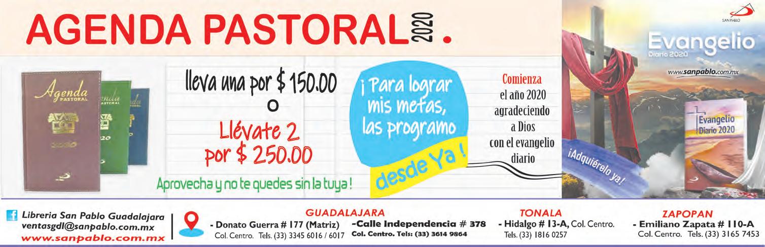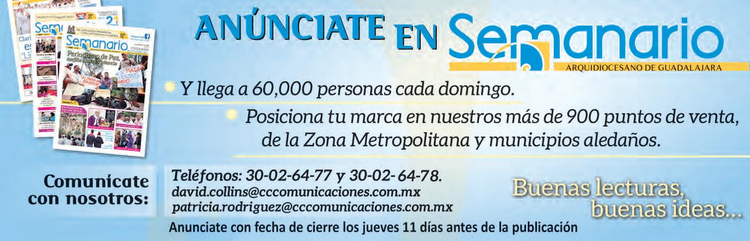 Teléfono: 3002-6470. Suscripciones: Ext. 1954 | Publicidad: Ext. 1906+1925 | Redacción: Ext. 1922 Horario de oficina: 8:30 a.m. a 5:30 p.m., correo electrónico: semanario@cccomunicaciones.com.mx Página Internet: http://www.semanario.com.mx Distribución: Mensajería Tercer Milenio, Jarauta N. 510-A, Tel. 3618-9670, planta alta. Guadalajara, Jal. C.P. 44360. Impreso por: Ediciones Católicas de Guadalajara, S.A. de C.V. con oficinas en Isla Flores N. 3344, Col. San José, Tlaquepaque, Jalisco. Tel. 3002-6470. Tiraje: 20,000 a 25,000 Consejo Editorial: