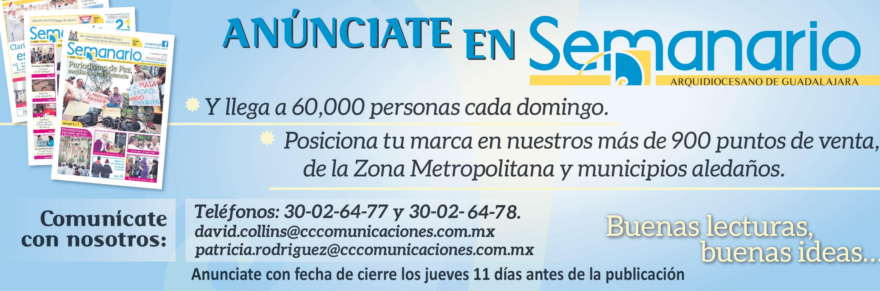 Teléfono: 3002-6470. Suscripciones: Ext. 1954 | Publicidad: Ext. 1906+1925 | Redacción: Ext. 1922 Horario de oficina: 8:30 a.m. a 5:30 p.m., correo electrónico: semanario@cccomunicaciones.com.mx Página Internet: http://www.semanario.com.mx Distribución: Mensajería Tercer Milenio, Jarauta N. 510-A, Tel. 3618-9670, planta alta. Guadalajara, Jal. C.P. 44360. Impreso por: Ediciones Católicas de Guadalajara, S.A. de C.V. con oficinas en Isla Flores N. 3344, Col. San José, Tlaquepaque, Jalisco. Tel. 3002-6470. Tiraje: 20,000 a 25,000