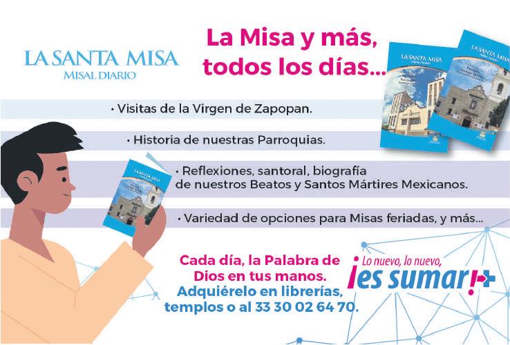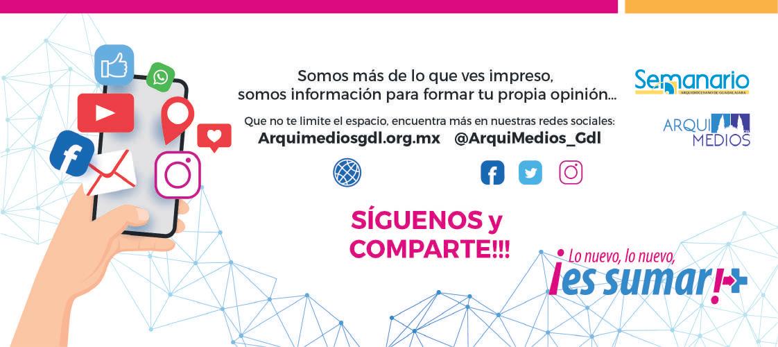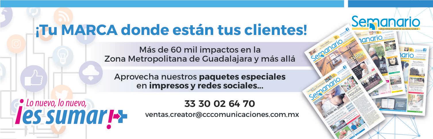 Órgano de Formación e Información Católica Semanario Arquidiocesano de Guadalajara, fundado por el Sr. Cardenal Dn. Juan Sandoval Íñiguez, el 24 de enero de 1997 • Registrado ante la Comisión Calificadora de Publicaciones y Revistas Ilustradas —CCPRI— en Certificados de Licitud de Título y Contenido números 10296 y 7226 expediente 1/432“97”/13565 el 20 de enero de 1998 y en el Instituto Nacional de Derecho de Autor, bajo reserva al uso exclusivo del título 04-2018-021211450400-101 el 12 de febrero de 2018 • Registro Postal Publicación Periódica PP14-0002-2000, autorización por SEPOMEX No se devuelven originales. Los escritos firmados son responsabilidad del autor, no de la publicación ni del titular Es una publicación editada por Creator Comunicación, S. de R.L. de C.V., con oficinas y redacción en Isla Flores N. 3344-2, Col. Jardines de San José, Guadalajara, Jal., México, C.P. 44950 A.P. 3-31. Los anuncios que se muestran en Semanario son responsabilidad, única y exclusivamente, del solicitante. No nos hacemos responsables de los servicios que se publicitan.