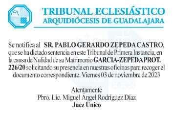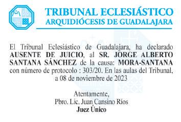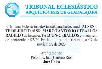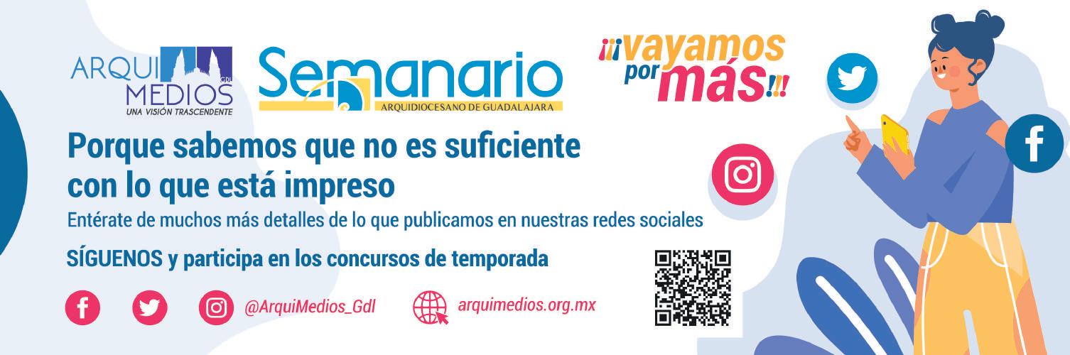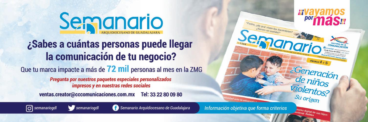 Semanario Arquidiocesano de Guadalajara Órgano de Formación e Información Católica Semanario Arquidiocesano de Guadalajara, fundado por el Sr. Cardenal Dn. Juan Sandoval Íñiguez, el 24 de enero de 1997 • Registrado ante la Comisión Calificadora de Publicaciones y Revistas Ilustradas —CCPRI— en Certificados de Licitud de Título y Contenido números 10296 y 7226 expediente 1/432“97”/13565 el 20 de enero de 1998 y en el Instituto Nacional de Derecho de Autor, bajo reserva al uso exclusivo del título 04-2018-021211450400-101 el 12 de febrero de 2018 • Registro Postal Publicación Periódica PP14-0002-2000, autorización por SEPOMEX No se devuelven originales. Los escritos firmados son responsabilidad del autor, no de la publicación ni del titular Es una publicación editada por Creator Comunicación, S. de R.L. de C.V., con oficinas y redacción en Isla Flores N. 3344-2, Col. Jardines de San José, Guadalajara, Jal., México, C.P. 44950 A.P. 3-31. Los anuncios que se muestran en Semanario son responsabilidad, única y exclusivamente, del solicitante. No nos hacemos responsables de los servicios que se publicitan.
