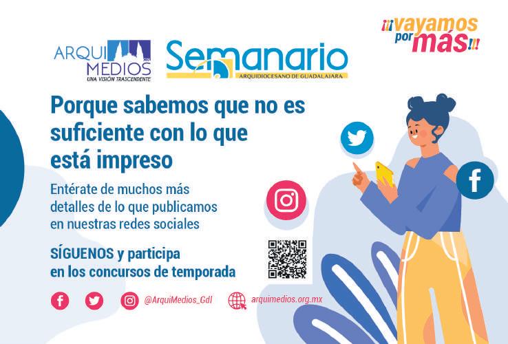 Semanario Arquidiocesano de Guadalajara Órgano de Formación e Información Católica Semanario Arquidiocesano de Guadalajara, fundado por el Sr. Cardenal Dn. Juan Sandoval Íñiguez, el 24 de enero de 1997 • Registrado ante la Comisión Calificadora de Publicaciones y Revistas Ilustradas —CCPRI— en Certificados de Licitud de Título y Contenido números 10296 y 7226 expediente 1/432“97”/13565 el 20 de enero de 1998 y en el Instituto Nacional de Derecho de Autor, bajo reserva al uso exclusivo del título 04-2018-021211450400-101 el 12 de febrero de 2018 • Registro Postal Publicación Periódica PP14-0002-2000, autorización por SEPOMEX No se devuelven originales. Los escritos firmados son responsabilidad del autor, no de la publicación ni del titular Es una publicación editada por Creator Comunicación, S. de R.L. de C.V., con oficinas y redacción en Isla Flores N. 3344-2, Col. Jardines de San José, Guadalajara, Jal., México, C.P. 44950 A.P. 3-31. Los anuncios que se muestran en Semanario son responsabilidad, única y exclusivamente, del solicitante. No nos hacemos responsables de los servicios que se publicitan.