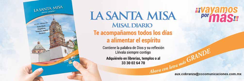 Órgano de Formación e Información Católica Semanario Arquidiocesano de Guadalajara, fundado por el Sr. Cardenal Dn. Juan Sandoval Íñiguez, el 24 de enero de 1997 • Registrado ante la Comisión Calificadora de Publicaciones y Revistas Ilustradas —CCPRI— en Certificados de Licitud de Título y Contenido números 10296 y 7226 expediente 1/432“97”/13565 el 20 de enero de 1998 y en el Instituto Nacional de Derecho de Autor, bajo reserva al uso exclusivo del título 04-2018-021211450400-101 el 12 de febrero de 2018 • Registro Postal Publicación Periódica PP14-0002-2000, autorización por SEPOMEX No se devuelven originales. Los escritos firmados son responsabilidad del autor, no de la publicación ni del titular Es una publicación editada por Creator Comunicación, S. de R.L. de C.V., con oficinas y redacción en Isla Flores N. 3344-2, Col. Jardines de San José, Guadalajara, Jal., México, C.P. 44950 A.P. 3-31. Los anuncios que se muestran en Semanario son responsabilidad, única y exclusivamente, del solicitante. No nos hacemos responsables de los servicios que se publicitan.