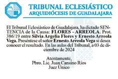 Se busca a la SRA. HERMELINDA MENDOZA CONTRERAS para que se presente en el Tribunal de la Arquidiócesis de Guadalajara Calle: Alfredo R. Plascencia No. 995, Col. Chapultepec Country, C.P. 44620 Guadalajara, Jal., de 9:00 a 14:00 hrs., de lunes a viernes, para tratar un asunto de nulidad de matrimonio de la CAUSA: SESATE - MENDOZA Si alguna persona puede darnos alguna información, favor de llamar al Tel 33 38273900 con el Sr. Pbro. Lic. Luis Heliodoro Salcedo Morales. En las aulas del Tribunal, lunes 30 de septiembre de 2024