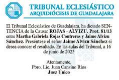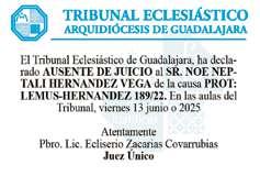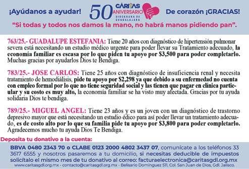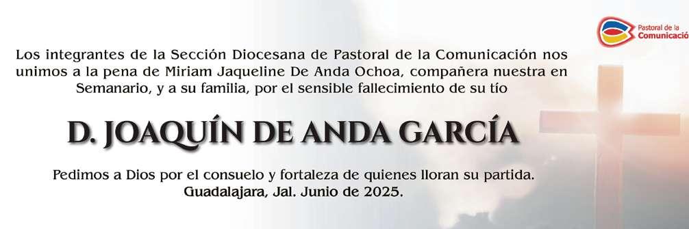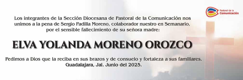 Semanario Arquidiocesano de Guadalajara Órgano de Formación e Información Católica Semanario Arquidiocesano de Guadalajara, fundado por el Sr. Cardenal Dn. Juan Sandoval Íñiguez, el 24 de enero de 1997 • Registrado ante la Comisión Calificadora de Publicaciones y Revistas Ilustradas —CCPRI— en Certificados de Licitud de Título y Contenido números 10296 y 7226 expediente 1/432“97”/13565 el 20 de enero de 1998 y en el Instituto Nacional de Derecho de Autor, bajo reserva al uso exclusivo del título 04-2018-021211450400-101 el 12 de febrero de 2018 • Registro Postal Publicación Periódica PP14-0002-2000, autorización por SEPOMEX No se devuelven originales. Los escritos firmados son responsabilidad del autor, no de la publicación ni del titular Es una publicación editada por Creator Comunicación, S. de R.L. de C.V., con oficinas y redacción en Isla Flores N. 3344-2, Col. Jardines de San José, Guadalajara, Jal., México, C.P. 44950 A.P. 3-31. Los anuncios que se muestran en Semanario son responsabilidad, única y exclusivamente, del solicitante. No nos hacemos responsables de los servicios que se publicitan.
