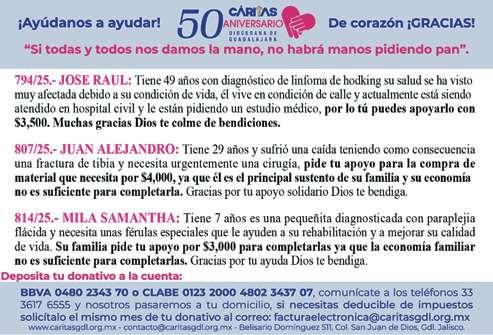 Órgano de Formación e Información Católica Semanario Arquidiocesano de Guadalajara, fundado por el Sr. Cardenal Dn. Juan Sandoval Íñiguez, el 24 de enero de 1997 • Registrado ante la Comisión Calificadora de Publicaciones y Revistas Ilustradas —CCPRI— en Certificados de Licitud de Título y Contenido números 10296 y 7226 expediente 1/432“97”/13565 el 20 de enero de 1998 y en el Instituto Nacional de Derecho de Autor, bajo reserva al uso exclusivo del título 04-2018-021211450400-101 el 12 de febrero de 2018 • Registro Postal Publicación Periódica PP14-0002-2000, autorización por SEPOMEX No se devuelven originales. Los escritos firmados son responsabilidad del autor, no de la publicación ni del titular Es una publicación editada por Creator Comunicación, S. de R.L. de C.V., con oficinas y redacción en Isla Flores N. 3344-2, Col. Jardines de San José, Guadalajara, Jal., México, C.P. 44950 A.P. 3-31. Los anuncios que se muestran en Semanario son responsabilidad, única y exclusivamente, del solicitante. No nos hacemos responsables de los servicios que se publicitan.