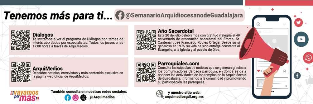 El Arzobispo de Guadalajara, el Cardenal José Francisco Robles Ortega, cuenta con Facebook, Instagram y X, lo mismo que la O cina de Prensa del Arzobispado de Guadalajara. Semanario y Arquimedios tienen las mismas redes sociales, además, un canal de YouTube. Coordinamos, también, la difusión del Santuario de los Mártires, sin olvidar Arquimedios Academy, espacio digital de formación.