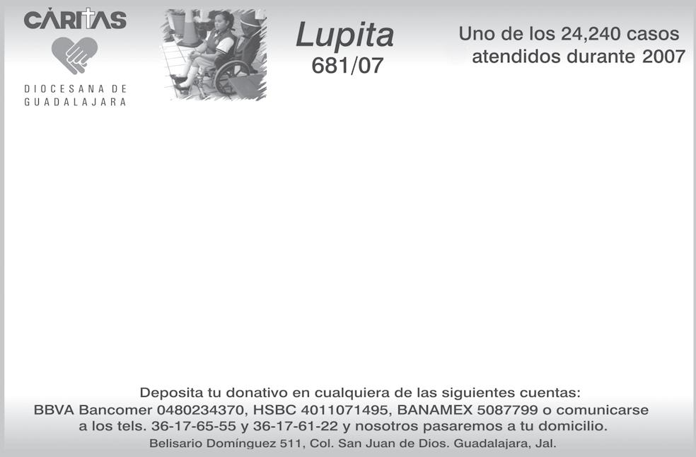 ❙ Órgano de Formación e Información Católica Semanario Arquidiocesano de Guadalajara, fundado por el Sr. Cardenal Dn. Juan Sandoval Íñiguez, el 24 de enero de 1997 ❙ Registrado ante la Comisión Calificadora de Publicaciones y Revistas Ilustradas —CCPRI— en Certificados de Licitud de Título y Contenido números 10296 y 7226 expediente 1/432“97”/13565 el 20 de enero de 1998 y en el Instituto Nacional de Derecho de Autor, bajo reserva al uso exclusivo del título 04-2001-082208480600-101 el 22 de agosto de 2001 ❙ Registro Postal Publicación Periódica PP14-0002-2000, autorización por SEPOMEX ❙ No se devuelven originales. Los escritos firmados son responsabilidad del autor, no de la publicación ni del titular ❙ Es una publicación editada por Creator Comunicacion, S de RL de CV., con oficinas y redacción en Isla Flores No. 3344-2, Col. Jardines de San José, Guadalajara, Jal., México, C.P. 44950 A.P. 3-31. Teléfono: 3002-6470. Suscripciones ext. 1953 | Publicidad ext. 1925 | Redacción ext. 1922 Horario de oficina: 8:30 am. a 5:30 pm., correo electrónico: semanario@cccomunicaciones.com.mx Página Internet: http://www.semanario.com.mx • Distribución: Mensajería Tercer Milenio, Jarauta No. 510-A, Tels. 3618-9670, planta alta. Guadalajara, Jal. C.P. 44360 Impreso por: Ediciones Católicas de Guadalajara, S.A. de C.V. con oficinas en Isla Flores No. 3344, Col. San José, Tlaquepaque, Jalisco. Tels. 3002-6470. Tiraje: 37,000 a 40,000