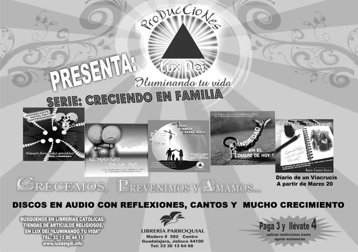 ❙ Órgano de Formación e Información Católica Semanario Arquidiocesano de Guadalajara, fundado por el Sr. Cardenal Dn. Juan Sandoval Íñiguez, el 24 de enero de 1997 ❙ Registrado ante la Comisión Calificadora de Publicaciones y Revistas Ilustradas —CCPRI— en Certificados de Licitud de Título y Contenido números 10296 y 7226 expediente 1/432“97”/13565 el 20 de enero de 1998 y en el Instituto Nacional de Derecho de Autor, bajo reserva al uso exclusivo del título 04-2001-082208480600-101 el 22 de agosto de 2001 ❙ Registro Postal Publicación Periódica PP14-0002-2000, autorización por SEPOMEX ❙ No se devuelven originales. Los escritos firmados son responsabilidad del autor, no de la publicación ni del titular ❙ Es una publicación editada por Creator Comunicacion, S de RL de CV., con oficinas y redacción en Isla Flores No. 3344-2, Col. Jardines de San José, Guadalajara, Jal., México, C.P. 44950 A.P. 3-31. Teléfono: 3002-6470. Suscripciones ext. 1953 | Publicidad ext. 1925 | Redacción ext. 1922 Horario de oficina: 8:30 am. a 5:30 pm., correo electrónico: semanario@cccomunicaciones.com.mx Página Internet: http://www.semanario.com.mx • Distribución: Mensajería Tercer Milenio, Jarauta No. 510-A, Tels. 3618-9670, planta alta. Guadalajara, Jal. C.P. 44360 Impreso por: Ediciones Católicas de Guadalajara, S.A. de C.V. con oficinas en Isla Flores No. 3344, Col. San José, Tlaquepaque, Jalisco. Tels. 3002-6470. Tiraje: 37,000 a 40,000